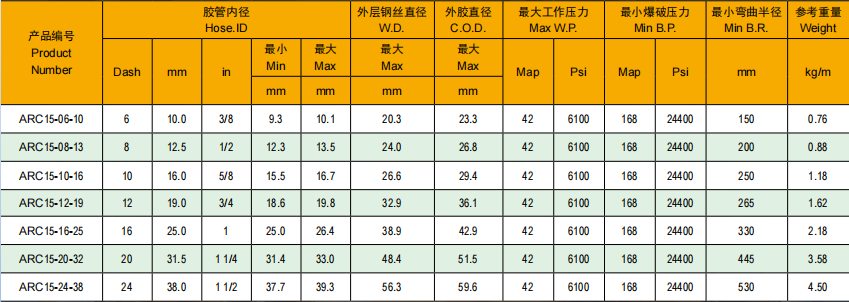 增強層:四層交互纏繞高強度鋼絲(尺寸 3/8 英寸,1/2 英寸,5/8 英寸,3/4 英寸和 1 英寸) 和六層交互纏繞高強度鋼絲(尺寸 1 1/4 英寸,1 1/2 英寸和 2 英寸)